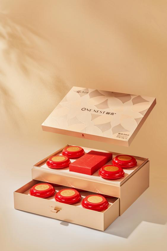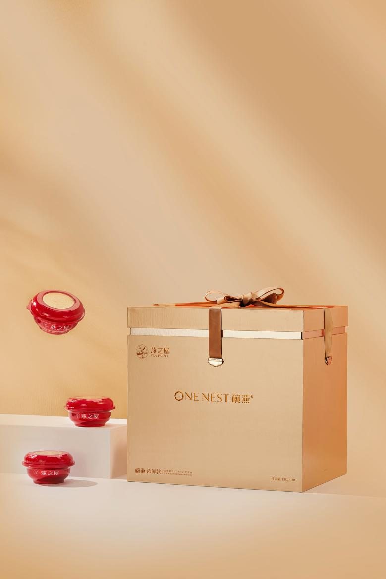 碗燕·浓鲜款为高品质生活而匠心打造,盛器与礼盒设计亦不失高贵,仪式感满满。礼盒采用尊贵典雅的香槟金色调,给人眼前一亮的高级感。盒盖选用燕之屋LOGO中的花瓣型进行延展,简约耐看,寄予“绽放”的美好寓意。礼盒内红金搭配的精巧小碗同样蕴藏巧思,碗盖以钻石型设计,与燕窝的珍贵滋养相契合,别具一格。碗盖一侧设计手捏“小耳朵”,开盖不卡顿,指尖不费力,还你优雅好姿态。碗内更有一层金属易撕膜,可减少碗内间隙空间,更好保护燕窝条状,而且轻撕超顺滑,燕窝不易撒漏,滋养不再浪费。此外,为满足不同滋养需求,碗燕·浓鲜款特别设计两款礼盒装,样样精致。碗燕·浓鲜款(30碗装)礼盒以层叠摆放,不占用过多空间,绑带设计可轻松拿取。碗燕·浓鲜款(10碗装)以上下层抽屉式设计,拿取产品不费劲,优雅滋养,从容自在。