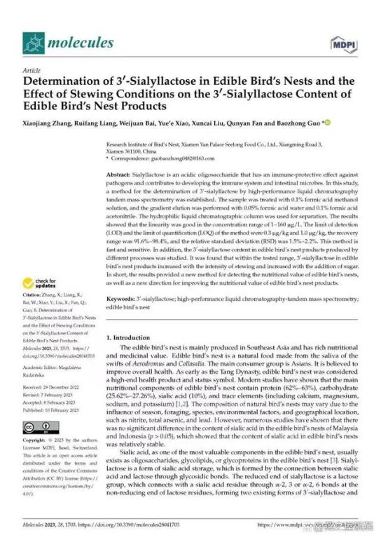 科技创新是产业发展的重要源泉和动力。多年来,燕之屋坚持传承中国滋补文化的同时,结合现代科研技术深入研究,充分挖掘燕窝的营养价值及功效。现代研究发现,“燕窝富含蛋白质、氨基酸、唾液酸和无机元素等,具有抗氧化、改善免疫、抑制血凝、调节肠道菌群等功效(来自:白伟娟等.《燕窝成分及功效研究进展》,2020)。”在燕之屋燕窝研究院科研团队新近发布的研究成果中,基于开创性地建立的燕窝中3'-唾液酸乳糖的LC-MS/MS测定方法,及两年的跟踪研究发现3'-唾液酸乳糖作为一种更容易吸收的唾液酸形态,适当的炖煮有助于燕窝中的唾液酸向更易吸收的3'-唾液酸乳糖的形态转化。研究表明,“碗燕产品中3'-唾液酸乳糖含量显著高于家庭炖煮燕窝(100℃ 30min)(来自:国际权威期刊《Molecules》,Determination of 3'-Sialyllactose in Edible Bird's Nests and the Effect of Stewing Conditions on the 3'-Sialyllactose Content of Edible Bird's Nest Products)。”如燕之屋旗下高端燕窝品牌碗燕飞天款的3'-唾液酸乳糖含量相对于于炖煮燕窝高达20余倍,表明燕之屋专利炖煮工艺(专利号:ZL201410393800.4 ;专利名称:一种速食燕窝软罐头的制作方法)能够激发燕窝的营养活性,提升燕窝产品的营养价值(来自:燕之屋燕窝研究院,碗燕产品五维营养分析报告)。”此外,燕之屋燕窝研究院科研团队一直以来燕之屋始终坚持走“研发立企、创新兴企”之路,基于研究成果不断对产品进行升级和创新,致力于为消费者打造更为科学、营养、健康的产品。截止至2023年8月1日,燕之屋发表论文共计44篇,其中SCI 11篇。