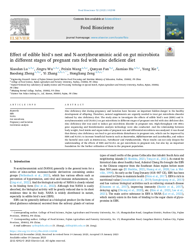 近年来,人们愈发关注肠道健康,越来越多的证据显示,肠道菌群能够通过产生菌群代谢产物、影响机体免疫反应、调节迷走神经及干预肠内分泌系统等多种途径和神经系统相互作用。基于此,燕之屋联合各大高校持续对食用燕窝的有益作用展开深入研究。今年1月,燕之屋关于“Effect of edible bird’s nest and N-acetylneuraminic acid on gut microbiota in different stages of pregnant rats fed with zinc deficient diet(食用燕窝和N-乙酰神经氨酸对低锌饮食孕鼠不同时期肠道菌群的影响)”的研究成果被食品科学领域国际知名SCI期刊《Food Bioscience》收录。