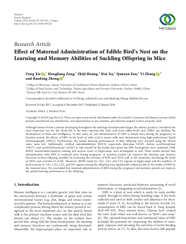 早在2018年3月,燕之屋关于“Effect of Maternal Administration of Edible Bird’s Nest on the Learning and Memory Abilities of Suckling Offspring in Mice(母鼠食用燕窝对子代学习记忆能力的影响)”的研究成果就登上了食品科学领域国际知名SCI期刊《Neural Plasticity》。研究结果表明,食用燕窝提升了子代脑内海马体中CA1,CA2和CA3区域的BDNF(一种神经营养因子)水平及CA1,CA2,CA3和DG区域的染色神经元数量,这标志着子代学习记忆能力的提升。该项研究推测食用燕窝通过增强超氧化物歧化酶和胆碱乙酰转移酶的活性,同时降低脑内丙二醛的水平和乙酰胆碱酯酶活性,来缓解氧化应激损伤、改善子代的学习记忆能力,是业界首次揭示母体食用燕窝对改善子代学习记忆能力的作用及机制的研究。