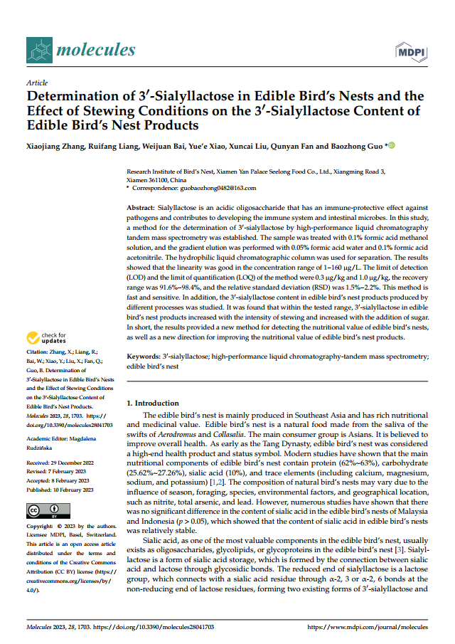 这种高价值的营养成分,是否仅存在于母乳中呢?2023年2月,燕之屋在国际权威期刊《Molecules》在线发表《Determination of 3'-Sialyllactose in Edible Bird's Nests and the Effect of Stewing Conditions on the 3'-Sialyllactose Content of Edible Bird's Nest Products》。该研究发现,即食燕窝中存在3'-唾液酸乳糖,而且其含量与炖煮工艺密切相关。燕之屋碗燕®所采用的121℃专利炖煮工艺*(*一种易撕盖包装容器的食品加工工艺,ZL202111218644.4)使碗燕®(文中批号UK04143)3'-唾液酸乳糖大幅提升至100℃炖煮燕窝的50倍。此项研究证明,炖煮有利于燕窝中的唾液酸向3'-唾液酸乳糖的形式转化,提升唾液酸的营养价值;相较之下,碗燕®(文中批号UK04143)所采用的121℃专利炖煮工艺*3'-唾液酸乳糖含量相对文中对比的鲜炖燕窝、家庭炖煮燕窝更高。该研究不仅证明了科学炖煮对于燕窝营养具有提升作用,进一步证实了碗燕®产品独特的营养价值。