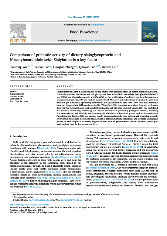 在不断的探索和研究过程中,相关研究成果也获得了国家知识产权局和国际权威期刊的认可。其中,发明专利“燕窝在制备治疗溃疡性结肠炎药物中的应用”(专利号: ZL 2021 1 0362817.3)近期获得国家知识产权局授权;论文“Comparison of prebiotic activity of dietary sialoglycoprotein and N-acetylneuraminic acid: Sialylation is a key factor”发表于国际权威期刊《Food Bioscience》,获SCI收录。