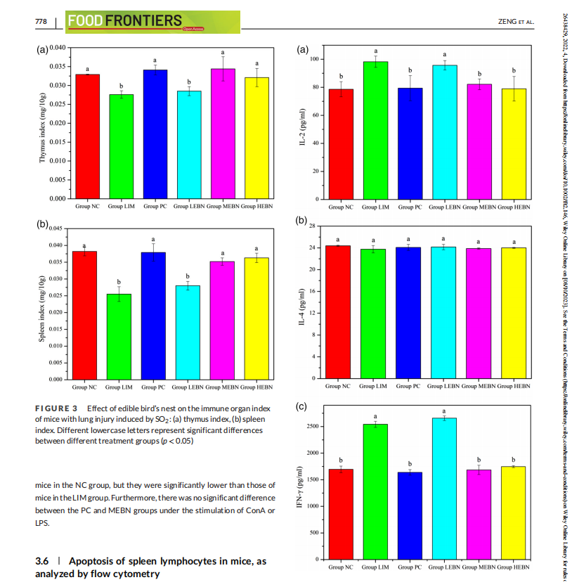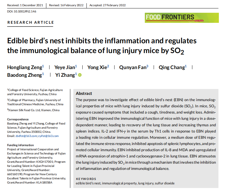 近日,燕之屋联合福建农林大学在《Food Frontiers》(国际权威ESCI期刊)发表论文“Edible bird's nest inhibits the inflammation and regulates the immunological balance of lung injury mice by SO2 ”,揭示燕窝具有保护肺部的功效。