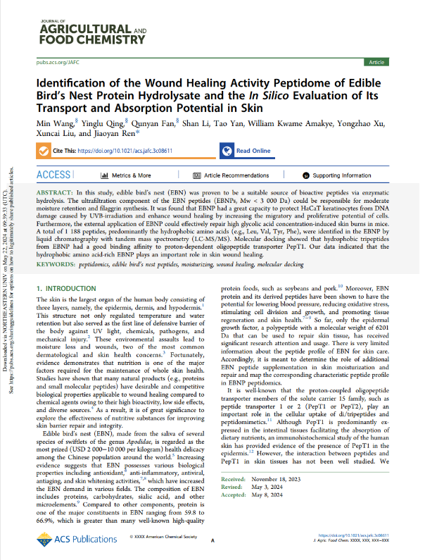 燕之屋多年来致力于燕窝肽的研发,挖掘燕窝肽功效与价值。2022年1月,燕之屋正式成立燕窝肽研究中心,开拓品牌在燕窝肽酶解技术、活性成分与功能研究、消费品研发、标准化等方向的新赛道,从制备工艺到活性研究均取得了显著进展和突破,其研究成果已刊登于多个国际权威期刊。2021年,燕之屋燕窝研究院和江南大学食品科学与技术国家重点实验室联合完成燕窝肽美白功能研究,成果“A study on the skin whitening activity of digesta from edible bird's nest: A mucin glycoprotein”发布于权威学术性期刊《Gels》;2022年,燕之屋燕窝研究院携手香港科技大学携手完成燕窝肽抗皮肤炎症功能研究,成果“Edible bird’s nest, an Asian health food supplement, possesses anti-inflammatory responses in restoring the symptoms of atopic dermatitis: An analysis of signaling cascades”发布于权威学术性期刊《Frontiers in Pharmacology》;2023年,燕之屋联合华南理工大学开展的燕窝肽皮肤修护功能的研究“Identification of the Wound Healing Activity Peptidome of Edible Bird‘s Nest Protein Hydrolysate and the In Silico Evaluation of Its Transport and Absorption Potential in Skin”被食品科学领域国际权威SCI收录期刊《Journal of Agricultural and Food Chemistry》正式收录;2024年,燕之屋深入挖掘了燕窝肽的美白作用机制,论文“Edible bird's nest peptide (EBNP) with high whitening activity: Sequences analysis, whitening activity characterization and molecular docking study”发表于SCI收录期刊《Journal of Functional Foods》。这些科研成果不仅体现了燕之屋在该领域的长期积累和深入探索,也彰显了其对科研工作的重视与持续投入,充分展现了其在食品科学领域的雄厚实力和高水平研究能力。