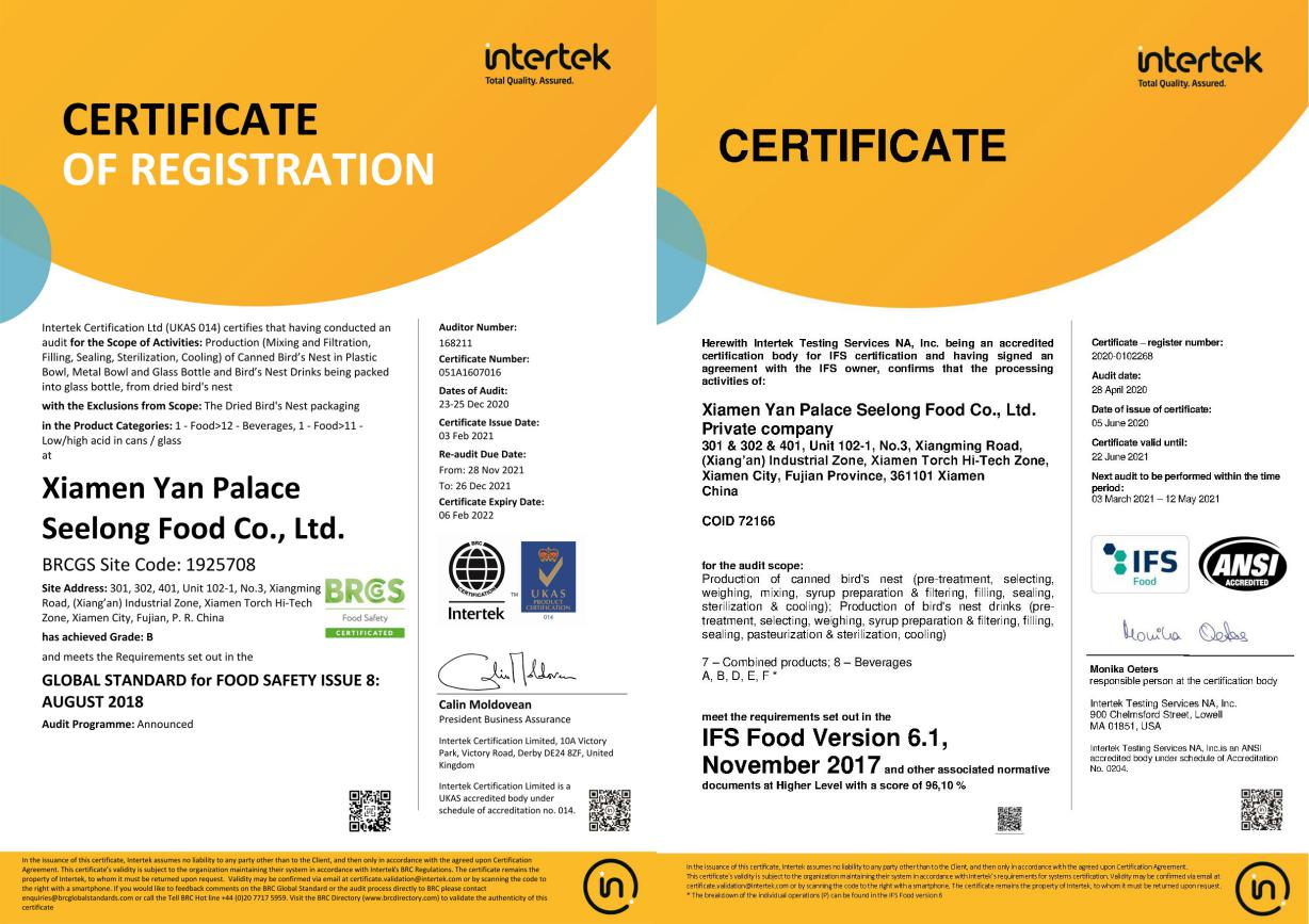 图:燕之屋获得BRC和IFS欧洲品质双认证