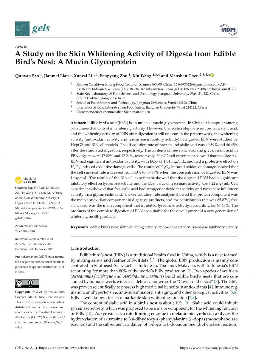 在2021年12月28日,燕之屋燕窝研究院和江南大学食品科学与技术国家重点实验室携手完成并刊登了专业研究成果《食用燕窝消化物的皮肤美白活性研究:一种黏蛋白糖蛋白》,并发布于权威学术性期刊《gels》。