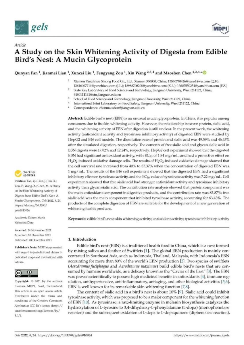 图:《食用燕窝消化物的皮肤美白活性研究:一种黏蛋白糖蛋白》
